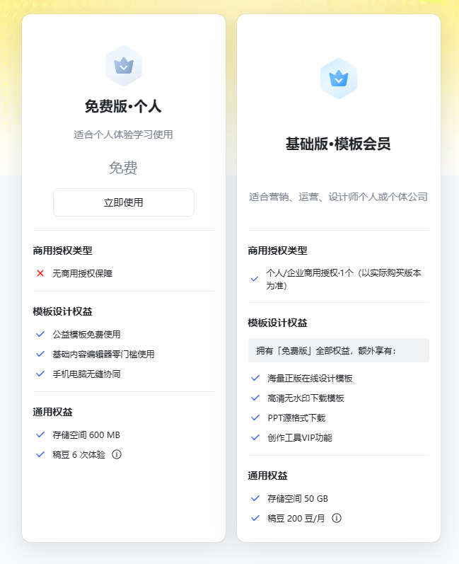 稿定设计会员基础版分为“个人商用授权”和“企业商用授权”,请根据您的实际需求选择。